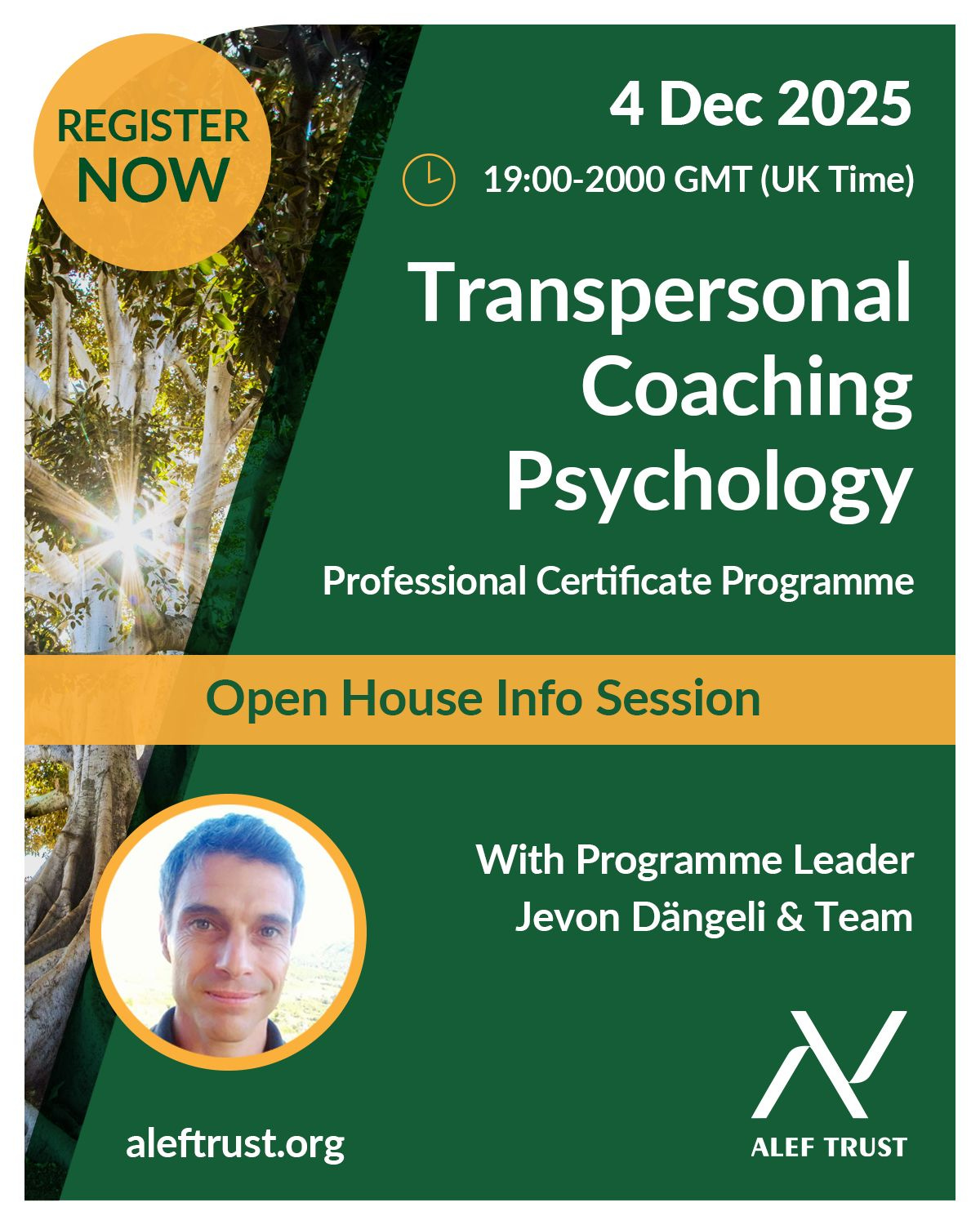 Are you called to bring greater depth, presence, and authenticity to your coaching practice? Alef Trust´s Transpersonal Coaching Psychology Certificate is a 12-month, part-time online programme designed for coaches, therapists, and helping professionals seeking to integrate psychological insight with spiritual, somatic, and creative approaches to human growth. During this live interactive session, Programme Leader Jevon Dängeli and tutor team will: